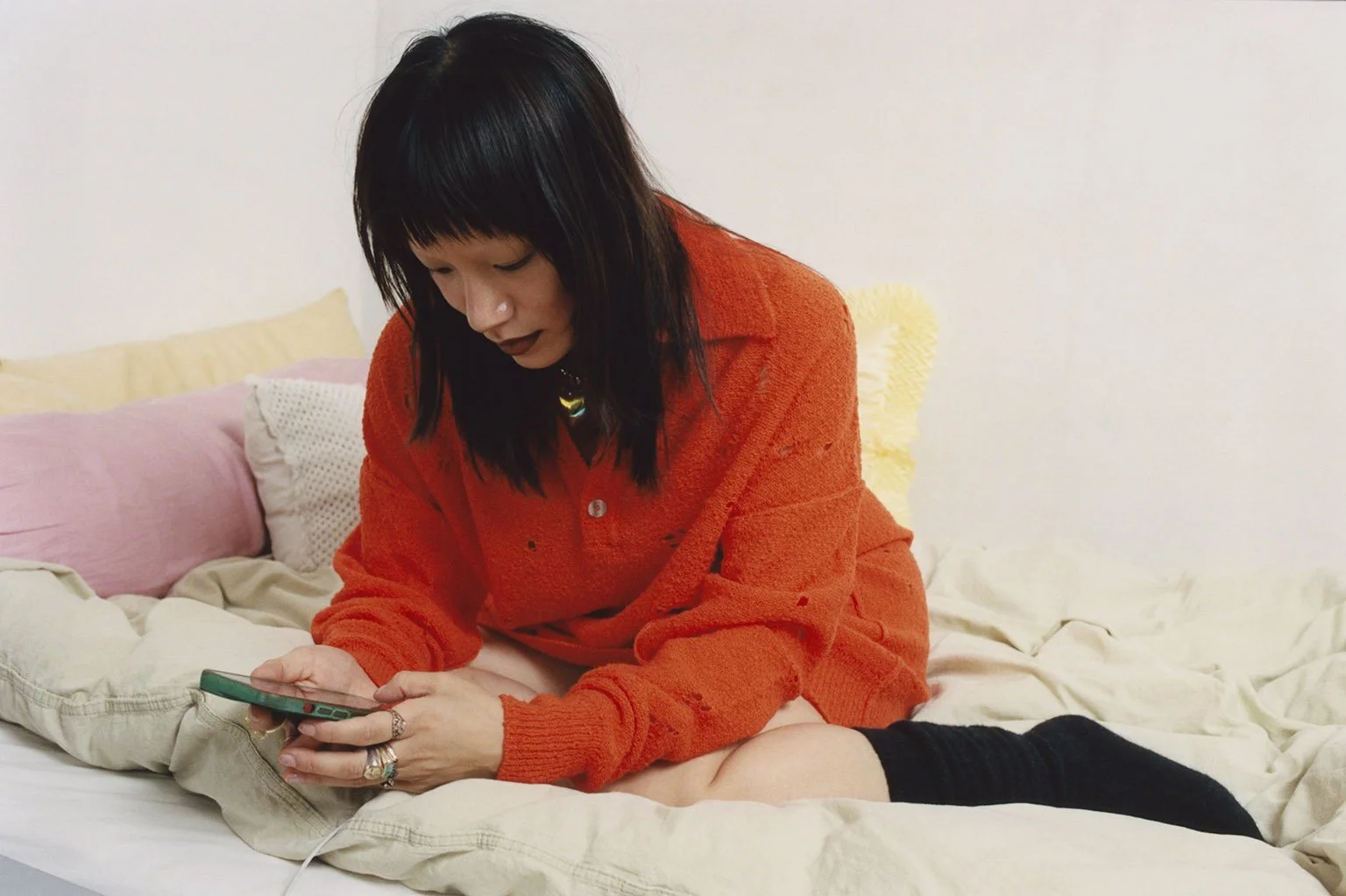 Inspired by the concept of our new collection Pillow Talk, Chinese photographer Mengyu Zhou captured April, Lotti, and Minh in the intimate setting of their Berlin bedrooms last September. Through this introspective series, Mengyu explores the beauty and imperfections that shape personal relationships, documenting tender, unguarded moments within the comfort of familiar, private spaces.